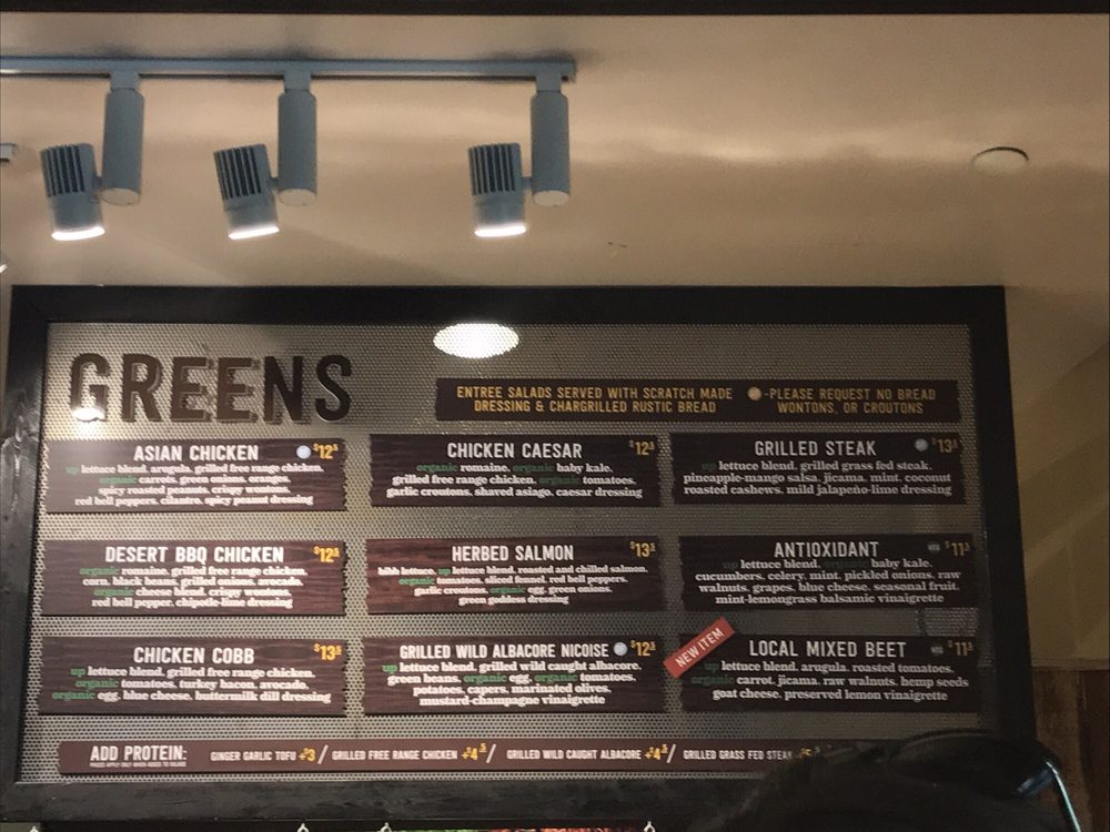 ramen noodles mixed with organic artisan lettuce, arugula, shredded cabbage, mandarin oranges, roasted peanuts, pineapple mango salsa, miso lemongrass dressing, grilled cage-free antibiotic & hormone free, never frozen chicken, spicy peanut dressing